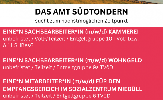 …zum nächstmöglichen Zeitpunkt …eine/n Sachbearbeiter*in (m/w/d) Sachgebiet Haushalt Amt Südtondern – unbefristet – Voll-/Teilzeit – EG 10 TVöD/A11 […]